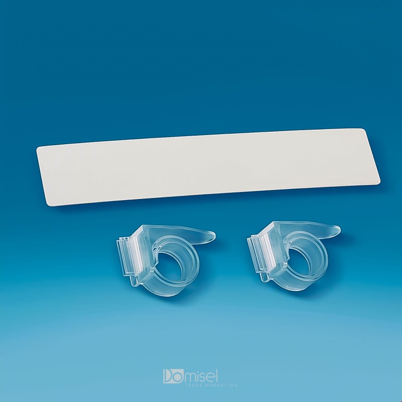 V kompletu 2 polžji sponki s samolepilno podlago in komunikacijo, veliko 400 x 50 mm. Polžja sponka se pritrdi v police delbe od 3 do 40 mm. Nakup možen samo v celih paketih (10, 15, 20, 25 kos...)