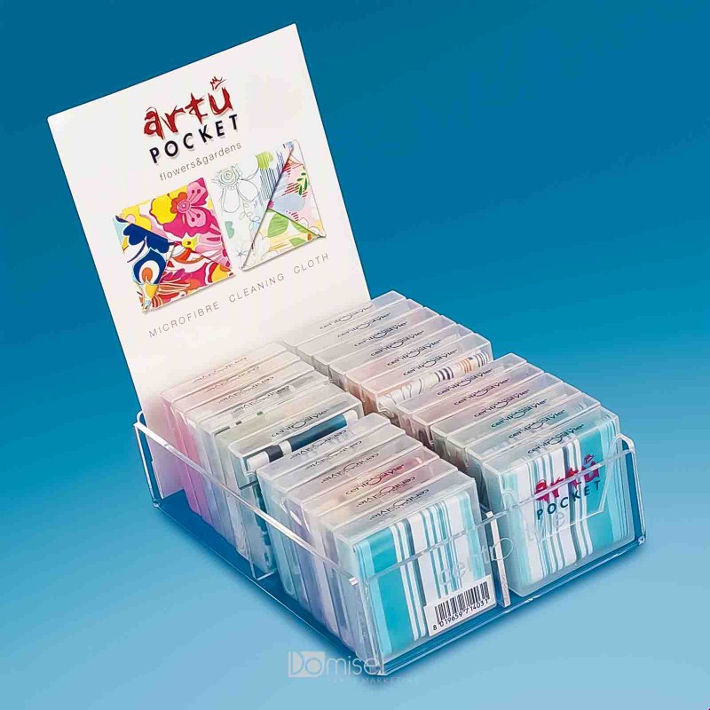 Pultno stojalo iz akrila, za razstavo tablic. Stojalo se postavi na mizo, pult ali polico. Po naročilu druge dimenzije. Nakup možen samo v celih paketih (5, 10, 15, 20, 25 kos...)