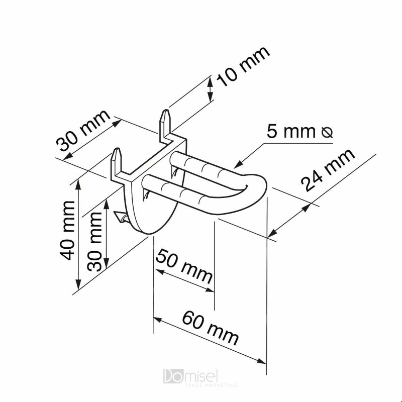 Plastična dvojna kljukica z avtomatskim kavljem, za obešanje na kartonske luknjičaste in navadne stene. Na izbiro v beli, črni in prozorni barvi.Na izbiro več dimenzij. Nakup možen samo v celih paketih (100, 200, 300 kos...)