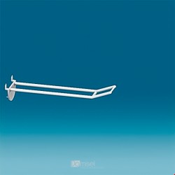 Dvojna plastična kljukica z dvemakavljema za obešanje na perforiranestene (razdalja med luknjami 25 mm.) Na izbiro v beli, črni in prozorni barvi.Na izbiro več dimenzij za kljukice.