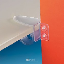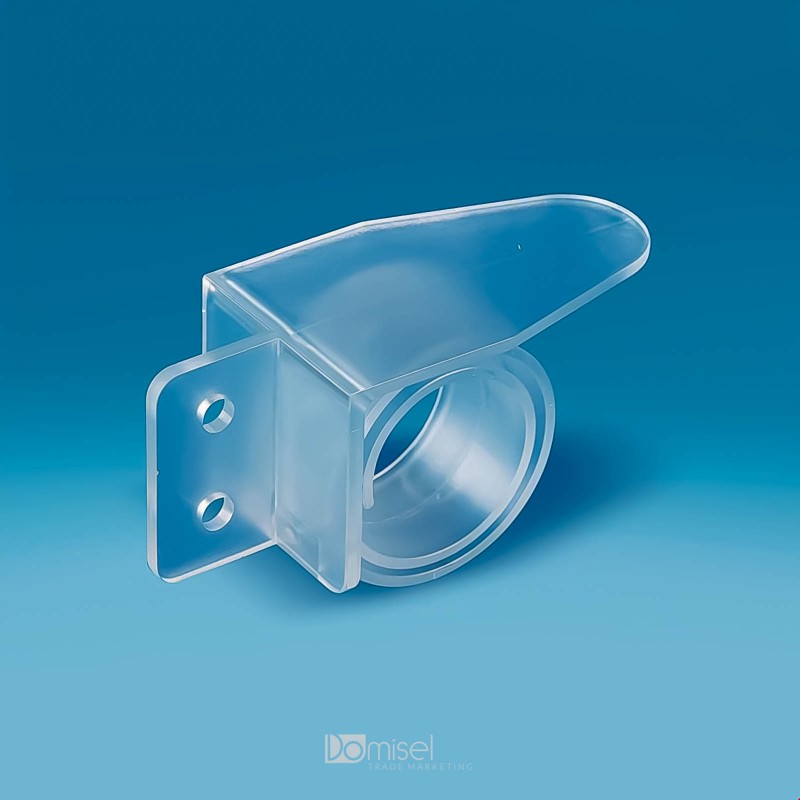 Polžja sponka s kavljem za vstavljanje cen, komunikacij in nosilcev. Ploščica daje bolj eleganten zgled policam zaradi oddaljenosti od sponke. Sponka se pritrdi na police, debele od 3 do 40 mm. Nakup možen samo v celih paketih (50, 60, 70, 80 kos...)