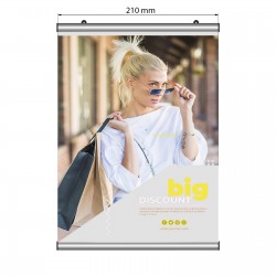 Aluminijast profili za obešanje posterjev, dolžine 600 mm. Sistem omogoča preprosto in praktično vstavljanje plakatov v profile. Profili se lahko obesijo na prozorne nosilce (priloženi v kompletu), ali prilepi s samolepilnim trakom na zid. V enem kompletu priložena zgornji in spodnji profil. LEGENDA SIMBOLOV