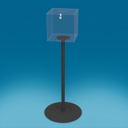 Škatla narejena iz akrilnega pleksi stekla. Dimenzije 400mmx400mmx300mm Višina stojala 1200mm Stojalo in okvir narejena iz srebrnega eloksiranga aluminijaZgornji pokrov ima ključavnico.Na steklo se lahko doda komunikacije.