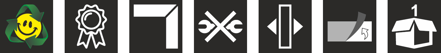 25 mm ali 35 mm debel srebrn eloksiran okvir na izbiro.Oglati robovi na izbiro. Na hrbtni strani samolepilni trak, za pritrditev na površino. Čez komunikacijo se pritrdi akrilna folija. Sestava ni potrebna. LEGENDA SIMBOLOV
