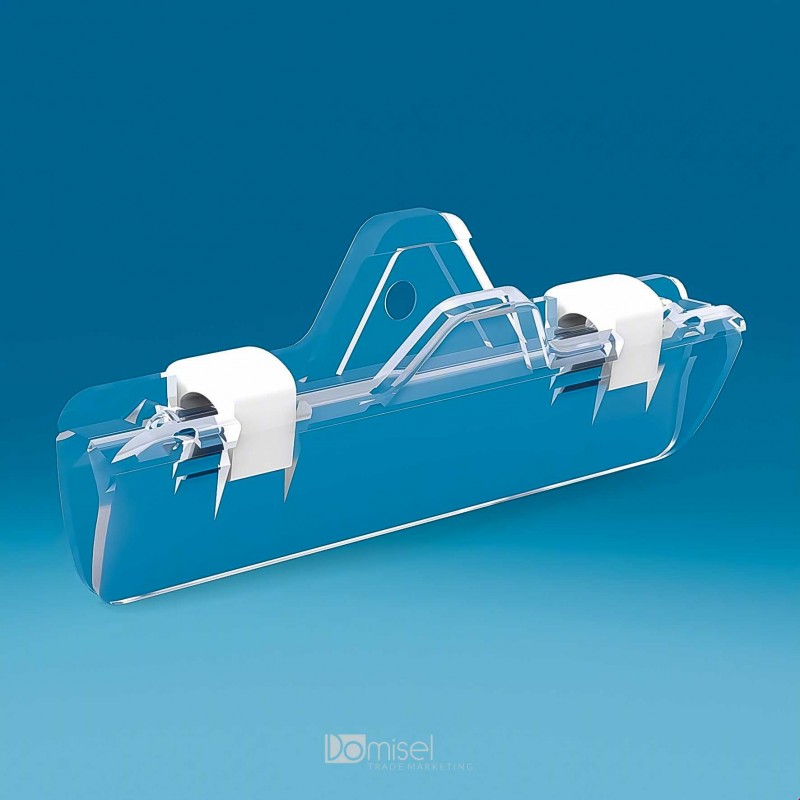 Prozorna plastična sponka za pritrjevanje komunikacij na razstavne izdelke, mize, stojala in pulte. Nakup možen samo v celih paketih (50, 100, 150, 200, 250 kos.)