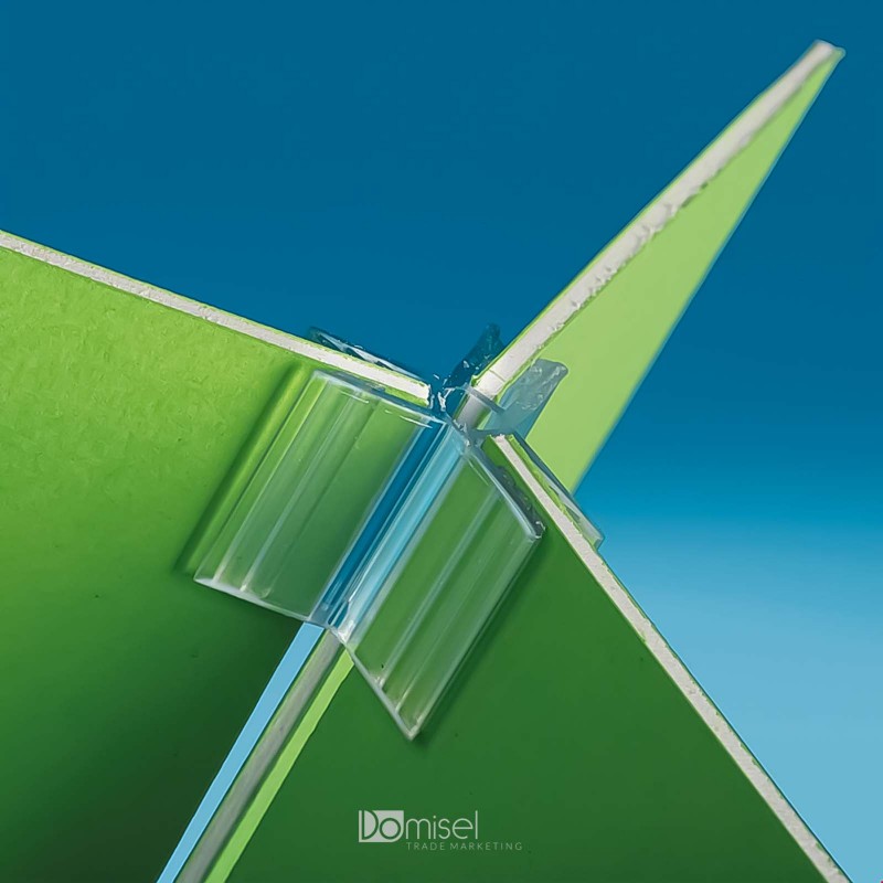 Dvostranska prozorna prijemalka, ki je nagnjena za 90°. Namenjena za povezovanje panel in komunikacij debelih od 3 do 5 mm. Nakup možen samo v celih paketih (100, 200, 300 kos...)