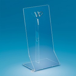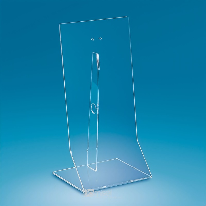 Pleksi pultno stojalo za obešanje izdelkov na kljukice za lamelne stene. Stojalo ima ojačano hrbtišče, za boljšo stabilnost. Spredaj na podstavek se lahko položi manjše predmete ali letake.